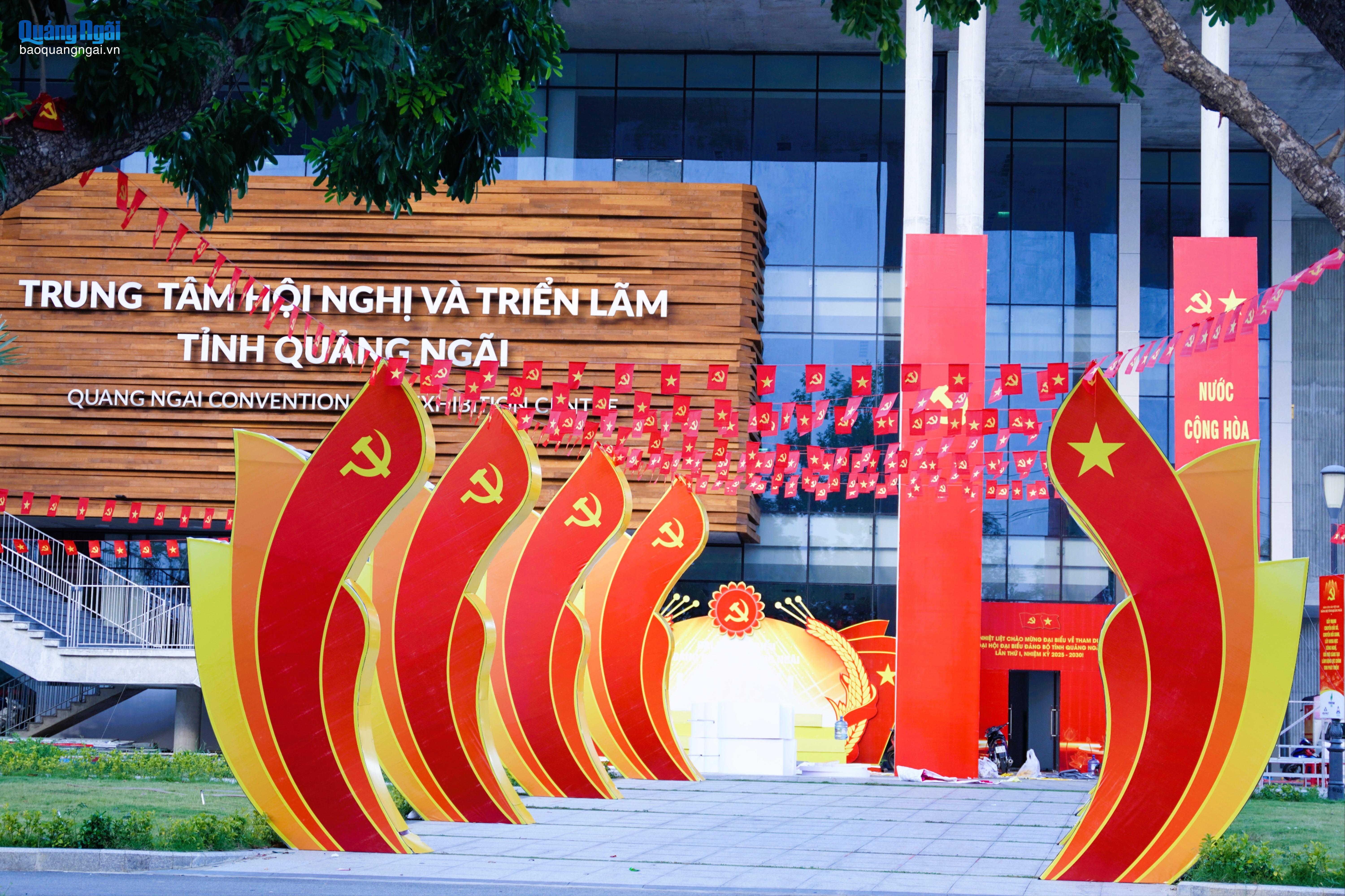 Công trình Trung tâm Hội nghị và Triển lãm tỉnh - nơi diễn ra Đại hội đại biểu Đảng bộ tỉnh lần thứ I, nhiệm kỳ 2025 - 2030, được trang trí rực rỡ.